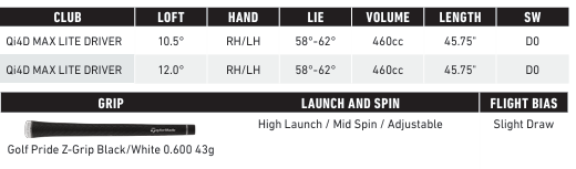 • For golfers seeking increased clubhead speed, the ultra-light spec package provides the Qi4D line’s lightest head mass, shaft and grip.